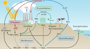 Nitrification and denitrification are responsible for the processing of ammonia fertilizer, ultimately leading to the generation of environmental pollutants that accumulate in waterways and the atmosphere. This Review describes the enzymes involved in these processes, which fascinate with their unusual active sites and the surprising reactions that they catalyse.