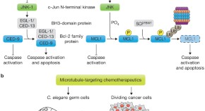 Anti-tubulin drugs are life-saving chemotherapeutics that kill cancer cells by stabilizing or disrupting microtubules. Despite their clinical utility, the molecular mechanisms by which anti-tubulins cause apoptotic cell death remain poorly understood. It is now shown that microtubule disruption can inhibit anti-apoptotic Bcl-2 family proteins through an evolutionarily conserved signalling axis involving DEPDC1 (LET-99 in Caenorhabditis elegans) and JNK.