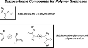 Polymer syntheses utilizing diazocarbonyl compounds as monomers are described. Pd-based initiators active for the C1 polymerization of diazoacetates have been developed; the presence of η3-type anionic ligand on the Pd center has been proved to be essential for the initiator to be highly active for the polymerization. Pd complexes bearing naphthoquinone or its derivatives as a ligand were effective for the initiator generation in conjunction with NaBPh4. By using a series of bis(diazocarbonyl) compounds as monomers, three-, two-, and single-component polycondensations have been newly developed, affording unprecedented polymer structures.