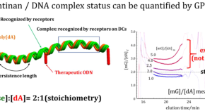 Lentinan (Len) is a linear (1,3)-β-d-glucan with two of its five main-chain glucose-bearing (1,6)-β-d-glucan side chains and has been clinically used for cancer treatment in combination with chemotherapy. In this paper, a structural analysis of Len was conducted using SAXS, GPC, and 13C quantitative NMR techniques, and a comparative study with other β-glucans was performed. The complexation between dA40 and Len caused the hypochromic effect. Len and dA40 showed a similar complexation with that of SPG; two main chain glucoses bind to one dA moiety by GPC.