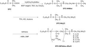 A number of amphiphilic N-isopropylacrylamide (NIPAAm) oligomers and polymers with a S-1-dodecyl-S′-trithiocarbonate (DTC) and an amino terminal group has been designed. The electrostatic interactions between the amine segments and the anionic metal cyanide complexes have a significant role in the morphology and thermoresponsiveness of the hybrids. The hybrids of PNIPAAms and metal complexes can lead not only to nanostructures in water but also to cylindrical aggregates (or spherical aggregates) assembled in rod, square and sheet structures.