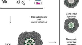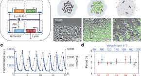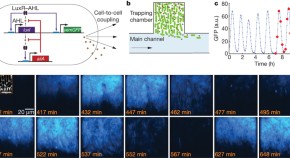 A defining focus of synthetic biology is the engineering of genetic circuits with predictive functionality in living cells. Here, a decade after the first synthesized genetic toggle switch and oscillator, an engineered gene network with global intercellular coupling is designed that is capable of generating synchronized oscillations in a growing population of cells.