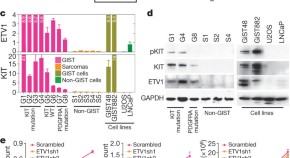 Gastrointestinal stromal tumours (GIST) are believed to arise in interstitial cells of Cajal (ICC). These authors show that the transcription factor ETV1 is required for ICC development and promotes the development of GIST. KIT, which is often activated by mutations in GIST, cooperates with ETV1 in the transformation of ICCs, in part by promoting ETV1 stabilization. Thus, a normal developmental lineage factor is switched into a tumour-promoting factor by a cooperating oncogene.