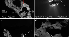 The size and spatial distribution of pits on comet 67P/Churyumov–Gerasimenko, which are active and probably created by a sinkhole process, imply that large heterogeneities exist in the physical, structural or compositional properties of the first few hundred metres below the current cometary surface.