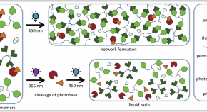 • Using two wavelengths to activate different photoreactions in a resin system has attracted attention in the scientific community. Here, the authors use wavelength orthogonal photochemistry to spatially control the curing kinetics of a thiol-ene photopolymerization reaction.
