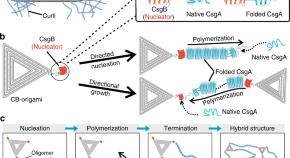 Curli are bacterial functional amyloids that have gained interest as self-assembling biomaterial for biotechnology applications. Here, the authors show that DNA origami decorated with CsgB nucleator proteins induced the site-specific nucleation and subsequent fibrillization of CsgA proteins.