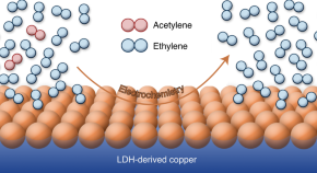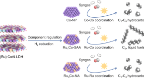 A series of FeO-CeO2 nanocomposite catalysts (FeCe-x) were successfully fabricated by hydrogen reduction of hydroxide precursors at temperatures (x) between 200–600 °C. A FeCe-300 catalyst with a Fe:Ce ratio of 2-1 exhibited excellent performance for photothermal CO2 hydrogenation to CO (CO selectivity = 99.87%, CO production rate 19.61 mmol h−1 gcat−1, excellent stability). The FeO phase was effective in promoting the reverse water-gas shift (RWGS, CO2 + H2 → CO + H2O). Catalysts prepared at higher reduction temperatures contained both Fe0 and FeO, with the Fe0 catalyzing the Sabatier reaction (CO2 + 4H2 → CH4 + 2H2O) and thus lowering FeCe-x catalyst selectivity to CO.