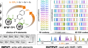 Molecules offer enormous capacity for information storage. Here, the authors show that information can be encoded into molecules with sequences of paramagnetic lanthanide ions, and decoded using nuclear magnetic resonance spectroscopy.