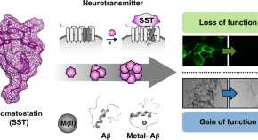 Metal-free amyloid-β (Aβ) and metal-bound Aβ (metal–Aβ) are found in the brain of patients with Alzheimer’s disease. Now, it has been shown that the conformation of a native neuropeptide, somatostatin, is changed in the presence of copper ions, Aβ and metal–Aβ. The conformational change results in a loss of function of somatostatin as a neurotransmitter and a gain of function as a modulator against metal–Aβ.