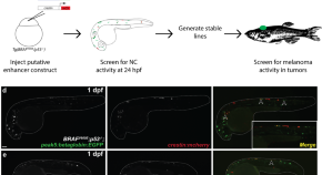 By performing ATAC-Seq on zebrafish melanoma tumours, Cunningham et al identify putative sox10 enhancers with embryonic activity in zebrafish. They identify a region upstream of sox10, termed peak5, that is needed for full expression of embryonic sox10 and for adult stripe patterning demonstrating an enhancer function for peak5 and provide insights into neural crest development and melanoma initiation.