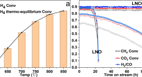 Dry reforming of methane into syngas typically requires high temperatures, which can cause aggregation and deterioration of the catalyst. Here, the authors report a lanthanum nickel oxide catalyst prepared by in situ hydrogen reduction of LaNi0.05Co0.05Cr0.9O3 on a LaCrO3 perovskite support that remains stable for over 100 h at 750 °C.
