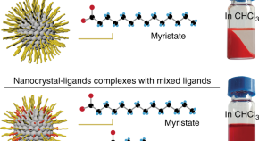 Entropic ligands can dramatically improve the solubility of nanocrystals, but it is not known how these mixed ligand systems actually arrange and interact on a particle surface. Here, the authors use advanced solid-state NMR techniques to understand the partitioning and dynamics of entropic mixed ligand shells on CdSe nanocrystals, and relate this molecular picture to the particles’ macroscopic solubility behavior.