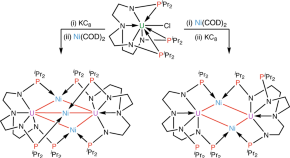 • Heterometallic clusters have shown promise in catalysis and small-molecule activation, but species comprising uranium–metal bonds have remained difficult to synthesize. Now, facile reactions between uranium and nickel precursors have led to nickel-bridged diuranium clusters supported by a heptadentate N4P3 scaffold. Computational analysis points to an unusual electronic configuration for uranium, U(iii)-5f26d1.