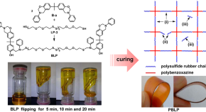 Benzoxazine bridged by a flexible polysulfide rubber chain (BLP) was conveniently prepared through the ring-opening addition of thiol-capped liquid polysulfide rubber (LP-3) and bisphenol-A/aniline-based benzoxazine (B-a). BLP was a highly viscous fluid at room temperature with a low curing temperature. After curing, the polymerized BLP (PBLP) presented excellent flexibility, outstanding thermal stability, and an extremely high char yield.