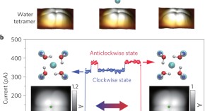 Resolving the internal structure of water molecules adsorbed on solid surfaces is challenging. Submolecular-resolution imaging of individual water monomers and tetramers on NaCl(001) films supported by a Au(111) substrate is now reported. The molecular orbitals of adsorbed water were directly visualized, which lead to the discrimination between the orientation of the monomers and the tetramers H-bond directionality.