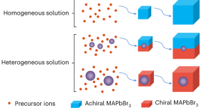 While chiral hybrid organic–inorganic perovskites are promising materials for optoelectronic applications, the synthesis of three-dimensional single crystals has proven challenging. Now, a general strategy has been shown to synthesize chiral, three-dimensional perovskites by heterogeneous nucleation. The single-crystalline materials contain no chiral component; their chiroptical activity arises from supercells formed by chiral patterns of the A-site cations.