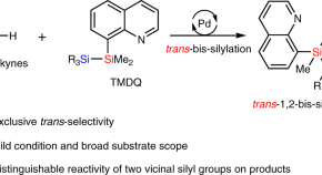 trans-Bis-silylation of alkynes is underdeveloped compared with cis-bis-silylation. Now, a Pd-catalysed method for the trans-bis-silylation of terminal alkynes is reported using disilane reagent 8-(2-substituted 1,1,2,2-tetramethyldisilanyl)quinoline to selectively form trans-bis-silylated alkenes. Mechanistic studies reveal that the reaction probably proceeds through a combined cis-bis-silylation and Z/E isomerization process.