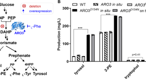 3-Deoxy-D-arabino-heptulosonate-7-phosphate synthase (DAHPS) is a key enzyme in the shikimate pathway for the biosynthesis of aromatic compounds, however, its activity is inhibited by L-Phe and L-Tyr. Here, the authors report the D154N point mutation of yeast DAHPS, which retains the wild type enzyme activity but relieves the inhibition by L-Phe, thus increasing the production of downstream aromatic amino acid derivatives.