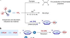 Difluorocarbene transfer is mostly limited to reactions that utilize its intrinsic electrophilicity. Now, a controllable palladium-catalysed difluorocarbene transfer reaction is reported that involves nucleophilic and electrophilic palladium difluorocarbene species. The selective reactions between arylboronic acids and the difluorocarbene precursor BrCF2PO(OEt)2 give four different products—difluoromethylated and tetrafluoroethylated arenes and their corresponding fluoroalkylated ketones.