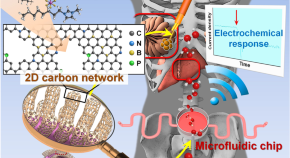 High-order 3D nanotube arrays (NTAs) arranged from mesoporous 2D N, B, P co-doped carbon network (NBP-CNW) were synthesize by a facile, well-controllable, eco-friendly and sustainable strategy using task-specific ionic liquids as precursors. NBP-CNW-NTAs modified flexible microelectrode was embed in microfluidic electrochemical biosensor chip for real-time tracking H2O2 secreted from different cancer cells (i.e., breast cancer cells, hepatoma cells and cervical cancer cells) with or without radiotherapy treatment. Furthermore, the functional microelectrode has been integrated into an implantable probe for in situ minimally invasive detection of surgically resected human breast specimens to identify the tumor tissues from the normal one.