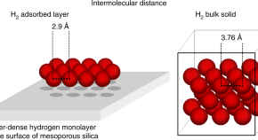 In some cases, hydrogen adsorption close to its boiling temperature shows unusually high monolayer capacities, but the microscopic nature of this adsorbate phase is not well understood. Now, H2 adsorbed on a well-ordered mesoporous silica surface has been shown to form a 2D monolayer with very short H2···H2 intermolecular distances and a density more than twice that of bulk-solid H2.