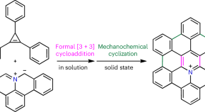 Heteroatom-embedded hexa-peri-hexabenzocoronenes (HBCs) display notable properties, but the selective incorporation of heteroatoms into the HBC core makes their synthesis difficult. Now a two-step process for the synthesis of 3a2-azahexabenzocoronenium salts is reported. The process comprises a formal [3 + 3] cycloaddition between azomethine ylides and cyclopropenes, followed by mechanochemical cyclization.