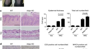 Adiponectin levels are decreased in metabolic syndrome and psoriasis patients. Here the authors show that adiponectin suppresses the pathogenic production of IL-17 of γδ T cells, and adiponectin administration improves psoriasis-like symptoms in a mouse model of the disease.