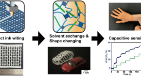 This work presents a simple strategy to prepare 3D printable and tough ionogels that can adjust to arbitrary topography. Inks for direct ink writing were prepared by dispersing cellulose nanocrystals in an aqueous solution of polyvinyl alcohol. After printing, the ink underwent a freeze-thaw process to form soft and stretchable hydrogels. Further reshaping and solvent exchange with deep eutectic solvents led to geometrically complex and tough ionogels for wearable sensors.