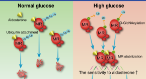 Role of O-linked-N-acetylglucosamine modification (O-GlcNAcylation) in mineralocorticoid receptor (MR) expression and transcriptional activity. Aldosterone binding promotes the proteasomal degradation of MR. O-GlcNAcylation of MR inhibits ubiquitin attachment to the MR and interferes with the receptor’s aldosterone-induced proteasomal degradation. As a result, O-GlcNAcylation increases the sensitivity of the MR to aldosterone and exacerbates aldosterone-associated complications (resistant hypertension, diabetic nephropathy and cardiovascular diseases).