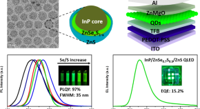 Bi et al. report eco-friendly green LEDs based on interfacial potential-graded ZnSeTe quantum dots with alleviated lattice mismatch and Auger recombination, resulting in peak efficiency of 21.7% at 520 nm, current efficiency of 75.7 cd A−1, and half-lifetime of 99.4 h at 1000 nits.