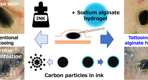 Preoperative marking or tattooing is performed in clinical situations using an India ink to identify gastrointestinal lesions. However, diffusion of the carbon particles from the ink results in unclear marking. We observed that subcutaneously injected sodium alginate solutions formed a gel and prevented the diffusion of carbon particles into the tissues of mice. Similar results were observed in resected porcine large intestines. The tattooed area was well correlated with the molecular weight and viscosity of sodium alginate, indicating that an adequately viscous sodium alginate hydrogel is useful for clear marking.
