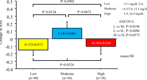Comparisons of the changes from baseline in vascular endothelial function parameters at 24 weeks among the 3 groups of low, moderae and high uric acid levels achieved with xanthine oxidase inhibitors. After adjustment for confounding factors, such as age, body mass index and concomitant diuretic use, which showed differences among the 3 groups, the change in RHI in the moderate uric acid level group tended to be higher than that in the high uric acid level group and was significantly higher than that in the low uric acid level group.