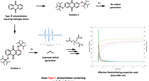 Silyloxy-substituted anthraquinones were evaluated as Type I photoinitiators for the visible light-induced radical polymerization of an acrylate monomer. Structure–activity correlations were established, and a mechanistic explanation of the observed activity trend was proposed. Isopropyl radicals were generated from compounds with a silyloxy group at position 1 and acted as the initiating species. The 1-substituted silyloxy anthraquinones synthesized herein are among the few Type I photoinitiators that have an anthraquinone skeleton and are sensitive to visible light (405 nm).