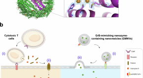 Granzyme B is an important factor in cytotoxic T lymphocytes anti-tumour immunity. Here, the authors report on a Pd-FTn granzyme B-mimicking nanozyme with a binuclear catalytic centre, delivered by functionalised nanovesicles to selectively trigger caspase-dependent apoptosis for a T cell-inspired cancer therapy.