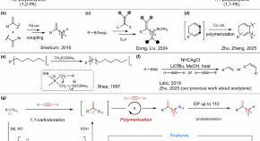 Alkynes are well known to undergo linear 1,2-addition polymerisations, but their 1,1 addition is much rarer and more challenging. Here, the authors use a Cd-catalysed 1,1-carboboration process to polymerise acetylene via 1,1-addition.