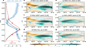 The hysteresis in precipitation-sea surface temperature sensitivity differs between strong El Niño and La Niña phases, with El Niño intensifying and shifting eastward due to deep convection, while La Niña is more equator-centered with a shorter hysteresis period, according to a large ensemble simulation of symmetric CO2 ramp-up and ramp-down pathways.