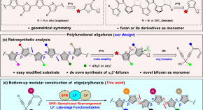 • Oligofurans have attracted great attention because of their strong fluorescence, charge delocalization, and increased solubility. Here the authors show a bottom-up modular construction of chemically and structurally well-defined oligo(arylfuran)s by de novo synthesis of α,β′-bifuran monomers and late-stage bromination, stannylation and subsequent coupling reaction.
