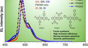 • Multi-resonance materials possess narrow emission spectra, desirable for high-definition organic light-emitting diodes, but most are based on a boron-nitrogen skeleton, providing limited opportunities to expand the scope of these materials. Here, the authors report carbonyl-nitrogen skeleton 5,12-dihydroquinolino[2,3-b]acridine-7,14-dione and develop three multi-resonance materials with efficient green emissions and high photoluminescence quantum yields, and further demonstrate their promise through the fabrication of efficient hyperfluorescence OLEDs.