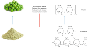 A series of in vitro, ex vivo and in vivo studies show that starch structure and plant tissue intactness control glucose release from pea-based foods. Modification of these characteristics through plant breeding and food processing may provide opportunities for enhanced food formulation, but challenges for labelling and communication.