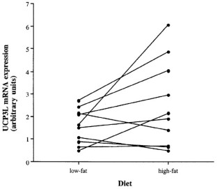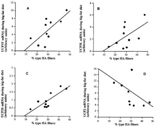 RESULTS: UCP3L mRNA expression tended to be higher on the high-fat diet, an effect which reached significance when only males were considered (P=0.037). Furthermore, diet-induced change in mRNA expression of UCP3T (r: 0.66, P=0.037), UCP3L (r: 0.61, P=0.06) and UCP2 (r: 0.70, P=0.025), but not UCP3S, correlated significantly with percentage dietary fat on the high-fat diet. Plasma FFA levels were not different during the two diets. Finally, the percentage of type IIA fibers was positively correlated with the diet-induced change in mRNA expression for UCP2 (r: 0.7, P=0.03), UCP3L (r: 0.73, P=0.016) and UCP3T (r: 0.68, P=0.03) but not with UCP3S (r: 0.06, NS).