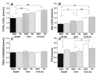 SUBJECTS: OVX Sprague-Dawley rats were compared to an ovariectomized-estradiol-treated group (OVXE2) and a Sham-operated (Sham) group. Each of these groups were subdivided into a sedentary and a treadmill-trained (8 wk) group.