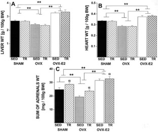 RESULTS: Plasma levels of 17β-estradiol and uterus weights were significantly (P<0.05) lower in OVX compared to Sham and significantly (P<0.01) higher in OVXE2 (hyperestrogenic) compared to Sham rats. Body weights were significantly (P<0.01) different among groups, in the following decreasing order: OVX, Sham and OVXE2. The average daily food intake and food efficiency were significantly (P<0.01) increased in OVX compared to Sham, whereas estradiol treatment diminished this effect (P<0.01). Exercise training did not alter any of the above-mentioned variables in any of the three estrogen groups. Mesenteric and subcutaneous fat weights were significantly (P<0.01) increased by OVX. This increase was abolished by estrogen replacement or by exercise training. Exercise training also decreased fat weights in OVXE2 and Sham rats. OVX resulted in a decrease in the weights of several other tissues (femur, heart, lungs, liver and adrenal glands) while hyperestrogenic replacement resulted in an increase in weight of all measured tissues. Aside from fat depots, exercise training did not affect any of the tissue weights with the exception for an increase in the weight of the plantaris muscle and adrenal glands and a decrease in lung weight in all three estrogen groups.