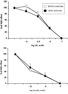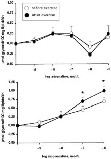 METHODS: The lipolytic responsiveness to adrenaline, isoprenaline (β-adrenergic agonist), UK-14304 (α2-adrenergic agonist) and insulin was studied in the isolated fat cell obtained by biopsies of subcutaneous adipose tissue from the peri-umbilical region before and after exercise.