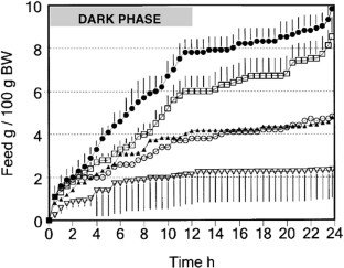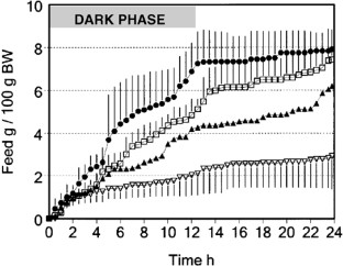 MEASUREMENTS: 24 h feed consumption was measured. From the time curves IC50 values of HMR1426 were calculated. Microanalysis of feeding behavior was determined. Macronutrient preference was measured, by offering rats three different diets. Gastric emptying was measured after liquid gastric loads or solid meals. In rats with gastric cannulas, milk consumption was measured with closed or open cannulas. Diabetes-related parameters and thyroid hormones were measured.