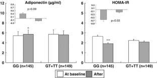 Plasma adiponectin, blood lipids, glucose and insulin concentrations were measured at baseline and after weight loss. Insulin resistance was estimated by homeostasis model assessment insulin resistance (HOMA-IR) derived from fasting glucose and insulin concentrations. We genotyped for three SNPs, 45T>G, 276G>T and −11377C>G.