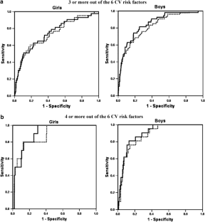 Weight, height, waist and hip circumference were measured in 2593 (52% boys, 47% girls) randomly sampled Hong Kong school children aged 6–12 years. In 958 of these and 97 additional overweight children (n=1055), the relationships between WC, BMI, waist/hip and waist/height ratio and six age-adjusted CV risk factors (>85% percentile levels of blood pressure (BP), fasting triglycerides, low-density lipoprotein (LDL) cholesterol, glucose and insulin levels, and <15% percentile levels of high-density lipoprotein (HDL) cholesterol) were studied. Receiver-operating characteristic analysis was employed to derive optimal age-adjusted sex-specific WC and BMI thresholds for predicting these measures of risk.