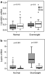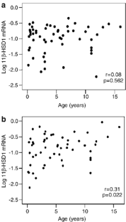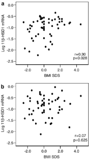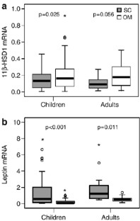 Paired biopsies (SC and OM) were obtained from 54 children (age 0.17–16 years, body mass index (BMI) 12.5–28.3 kg/m2, BMI standard deviation score (SDS) −2.5–4.5) and 16 adults (age 27–79 years, BMI 19–46 kg/m2) undergoing open abdominal surgery. mRNA levels of 11β-HSD1, leptin and resistin were measured using quantitative real-time polymerase chain reaction (PCR).
