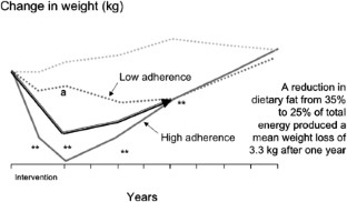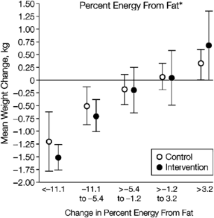 There is a need to explore how to increase the satiating power of the diet, so that people feel full with less energy, and by this means reduce their spontaneous energy intake. A reduction of dietary fat from typically 37–27% of total calories will produce a weight loss of 3–5 kg over 6 months, depending on the amount and source of carbohydrate and protein in the diet. The weight loss is sustained as long as the diet composition is adhered to, and evidence from the large Women's Health Initiative dietary intervention trial showed that those who complied with the fat reduction without any energy restriction maintained a lower body weight over 9 years than those on a normal fat diet. The predominant mechanism for the weight loss effect is the lower energy density of the fat-reduced diet, so that this diet provides more food volume and weight for less energy, and hence greater satiating effect than a higher-fat diet. It is likely that the diet also provides a metabolic advantage in individuals susceptible to obesity by a genetically determined impaired ability to rapidly adjust fat oxidation in response to increasing the dietary fat content. The carbohydrate source is also important for the diet's effect on body weight, that is, whereas sugars in solid foods seem to have the same satiating effect than starch, sugar in drinks seems to exert a low inhibition of subsequent food intake. Newer research indicates that increasing the protein content at the expense of fat and carbohydrate might offer a way to increase the satiating and thermogenic effect of ad lib diets, and facilitate weight loss and maintenance.