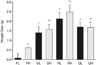 AAD-treated mice gained significantly more weight than controls after 3 weeks (P<0.001). Treatment and diet had significant effects on FI and EI over time (P<0.001). AAD-treated mice had significantly higher FE than controls (P<0.05); however, there was no significant drug by diet interaction (P=0.65). Risperidone low-fat mice gained significantly more absolute fat mass than placebo low-fat mice (P<0.05). All treatment groups, except quetiapine low-fat and olanzapine high-fat, gained significantly more absolute lean mass than placebo controls (P<0.05). Cholesterol levels were significantly lower in quetiapine and risperidone than placebo (P<0.05). Risperidone low-fat mice had significantly higher triglyceride levels than placebo and risperidone high-fat mice (P<0.05).