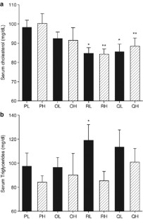 Female C57BL/6J mice were treated with atypical antipsychotics for 3 weeks and fed either a low-fat or high-fat diet (4.6 vs 15.6% fat by wt). Food intake (FI), body weight (BW), body composition, and serum lipids were measured during treatment with optimized doses of olanzapine, quetiapine, and risperidone. Energy intake (EI) and feed efficiency (FE) were calculated. Group differences in change were analyzed via repeated measures analysis of variance (ANOVA). Serum lipid concentrations, EI and FE were compared using two-way ANOVA.